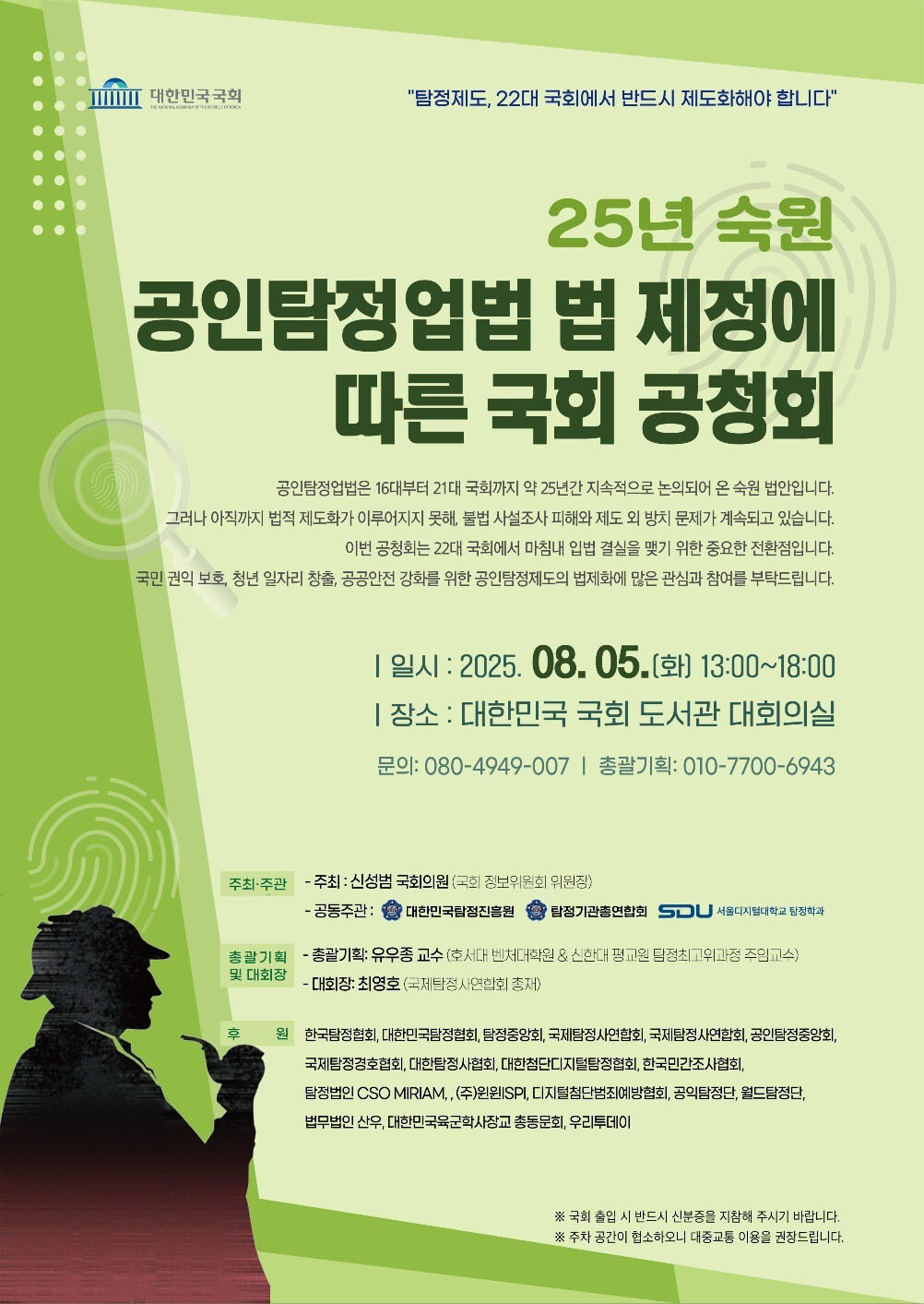 이번 공청회는 "탐정제도, 22대 국회에서 반드시 제도화해야 합니다!"라는 주제로 탐정의 날 5주년을 기념하여 개최되며, 신성범 국회의원(국회정보위 위원장)이 주최하고 서울디지털대학교 탐정학과와 대한민국탐정진흥원, 탐정기관총연합회가 공동주관한다.