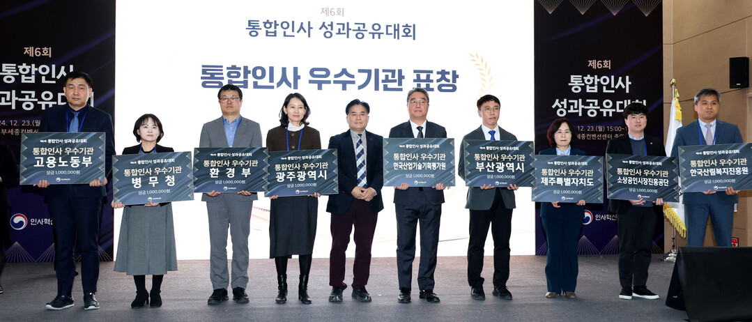 인사혁신처(처장 연원정)는 23일 정부세종컨벤션센터에서 열린 ‘제6회 통합인사 성과공유대회’에서 중앙부처, 지방자치단체, 공공기관 등을 대상으로 공직 다양성 확대와 인사 혁신 성과를 인정받은 9개 우수기관에 표창을 수여했다. 이번 대회에는 중앙행정기관 3곳, 지방자치단체 3곳, 공공기관 3곳이 선정됐다.
