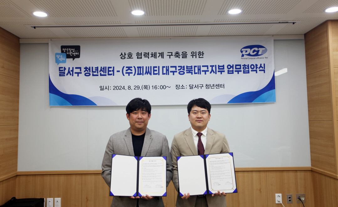 2024년 8월 29일(목) 대구 달서구 청년센터에서는 국가공인자격 PCT 본부-대구경북지부 계약식 및 달서구 청년센터-(주)피씨티 대구경북지부 업무협약식이 진행되었다.
