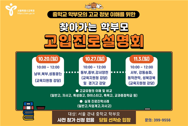 시교육청은 10월 20일, 27일, 11월 3일 세 차례에 걸쳐 각 교육지원청 강당 등에서 ‘찾아가는 학부모 고입진로설명회’를 개최한다.