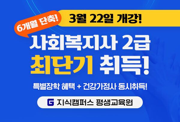 한편 지식캠퍼스평생교육원은 오는 3월 22일 개강에 사회복지사 취득과정과 함께 학위취득(심리학) 과정도 함께 개강한다. 자세한 내용은 홈페이지 또는 전화문의를 통해 확인 가능하다.