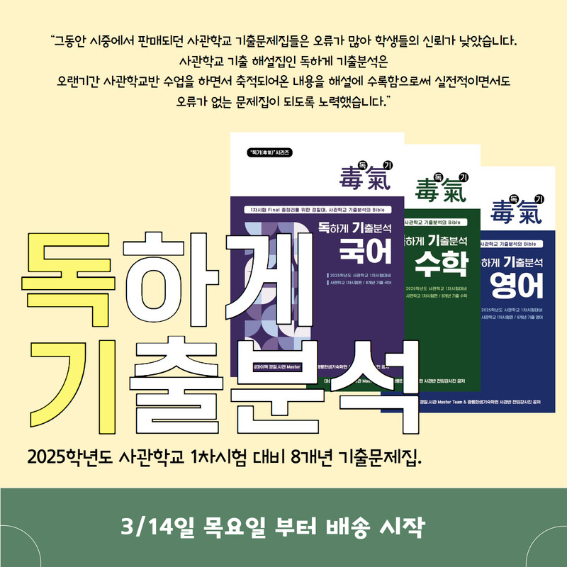 특히 ‘독하게 기출분석’은 평가원 기출로 공부했던 학생들이 평가원 기출분석의 연장선에서 사관학교 1차시험을 분석할 수 있도록 자세한 해설을 수록했다. 또한 자연스럽게 사관학교 1차시험과 평가원 시험의 ‘작은 차이’를 느낄 수 있도록 구성된 것도 특징이다.