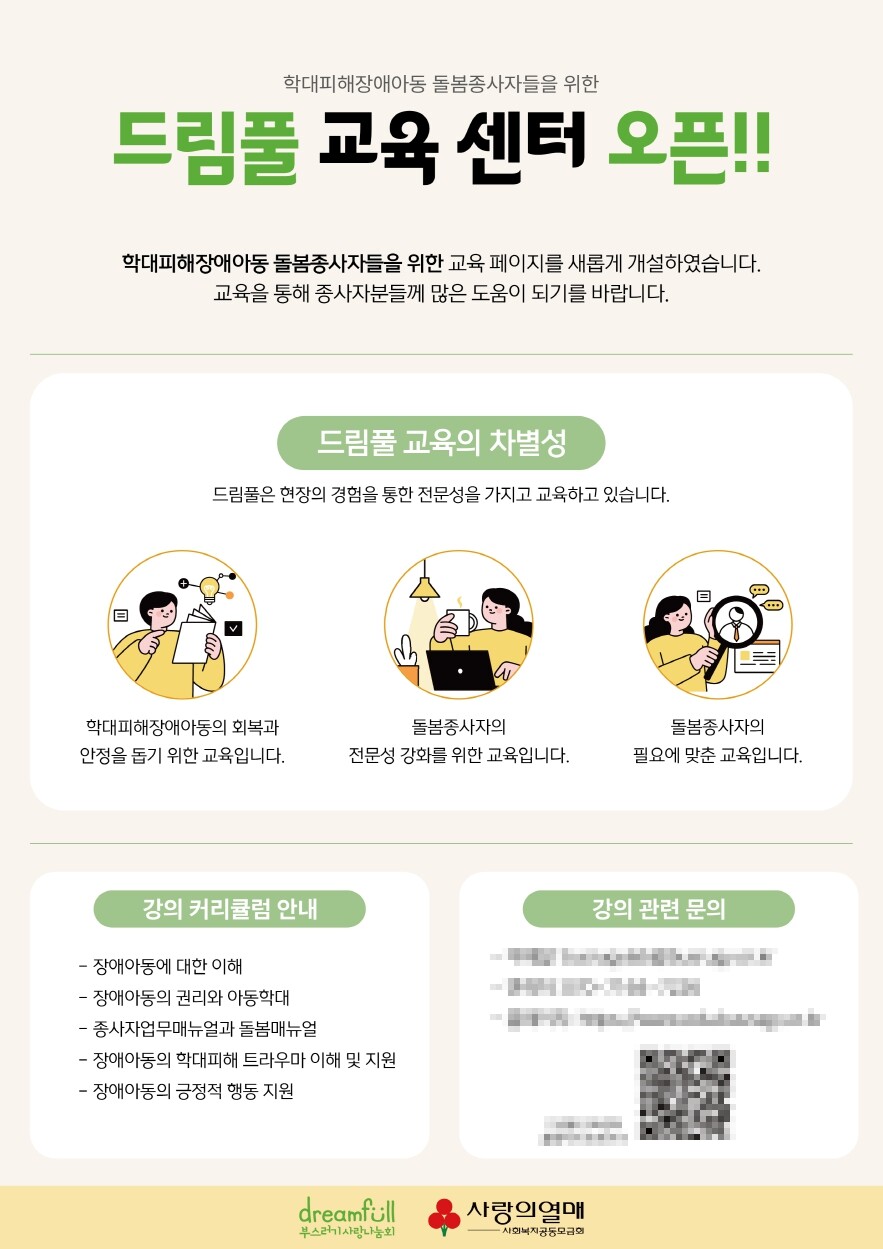 교육센터는 학대피해장애아동 돌봄 종사자뿐만 아니라, 장애아동 돌봄에 관심 있는 누구나 참여할 수 있도록 개방형 교육으로 운영되며, 언제 어디서나 편리하게 학습할 수 있는 것이 특징이다. 해당 사업은 사회복지공동모금회의 지원을 받아 학대피해장애아동·청소년 지원 및 보호체계 구축사업의 일환으로 추진되며, 전문가들의 연구와 현장 종사자의 피드백을 반영해 실무에서 즉시 활용할 수 있도록 구성되었다.