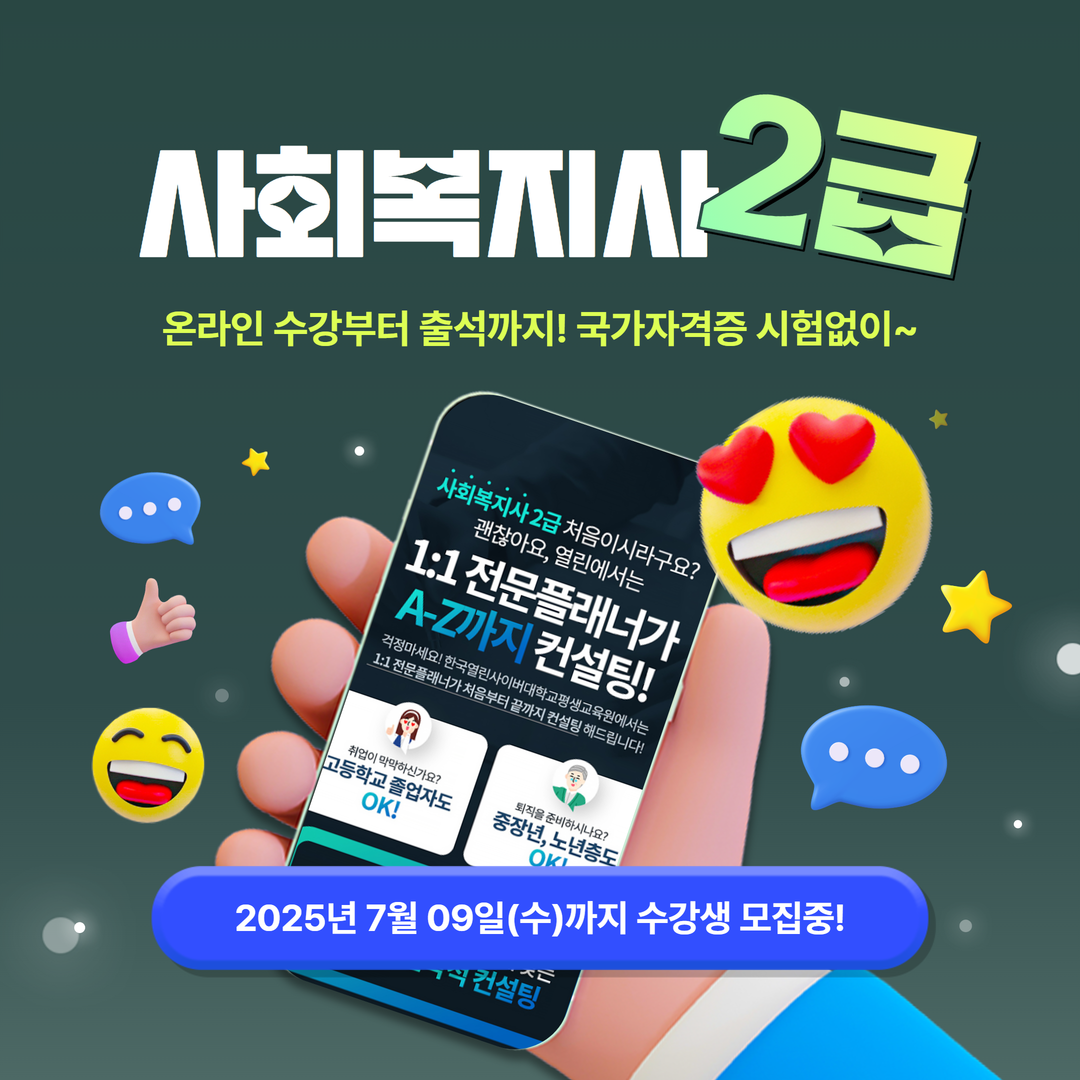 한국열린사이버대학교 평생교육원은 공공 및 복지 분야의 전문 인재를 양성하기 위한 ‘사회복지사 2급’ 교육과정의 수강생을 7월 9일(화)까지 모집한다고 밝혔다.