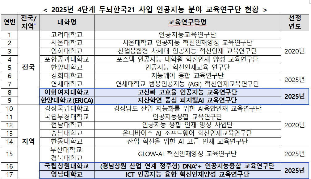 선정평가 결과, ▲이화여대 ‘고신뢰 고효율 인공지능 교육연구단’ ▲한양대(ERICA) ‘지산학연 중심 피지컬 인공지능 교육연구단’ ▲국립창원대 ‘DNA2+ 인공지능융합 교육연구단’ ▲영남대 ‘ICT 인공지능 융합 혁신인재양성 교육연구단’이다.