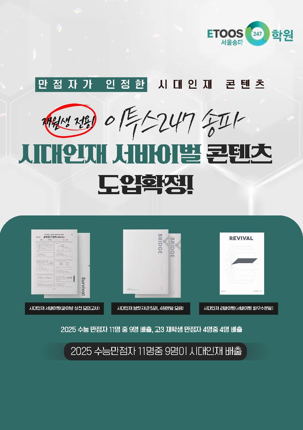 이투스247학원 송파점 관계자는 “시대인재서바이벌 콘텐츠 도입을 통해 수험생들이 더욱 효과적으로 실전 대비를 할 수 있도록 지원할 것”이라며, “2026학년도 수능을 목표로 하는 학생들에게 최적의 학습 환경과 전략적인 학습 관리 시스템을 제공하겠다”고 전했다.