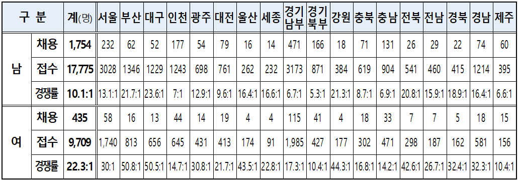 ▲서울 30:1(58명 채용/1,740명 출원) ▲부산 50.8:1(16명 채용/813명 출원) ▲대구 50.5:1(13명 채용/656명 출원) ▲인천 14.7:1(44명 채용/645명 출원) ▲광주 30.8:1(14명 채용/431명 출원) ▲대전 21.7:1(19명 채용/413명 출원) ▲세종 22.8:1(4명 채용/91명 출원) ▲경기남부 17.3:1(115명 채용/1,985명 출원) ▲경기북부 10.4:1(41명 채용/427명 출원) ▲강원 44.3:1(4명 채용/177명 출원) ▲충북 16.8:1(18명 채용/302명 출원) ▲충남 14.2:1(33명 채용/471명 출원) ▲전북 42.6:1(7명 채용/298명 출원) ▲전남 26.7:1(7명 채용/187명 출원) ▲경북 32.4:1(5명 채용/162명 출원) ▲경남 32.3:1(18명 채용/581명 출원) ▲제주 10.4:1(15명 채용/156명 출원)의 경쟁률을 기록했다.