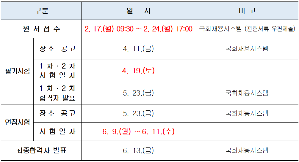 필기시험을 4월 19일(토) 전국에서 동시에 실시되며 합격자는 5월 23일(금) 발표된다. 이후 6월 9일부터 11일까지 면접시험을 진행하며, 최종 합격자는 6월 13일 국회채용시스템에서 공개될 예정이다.