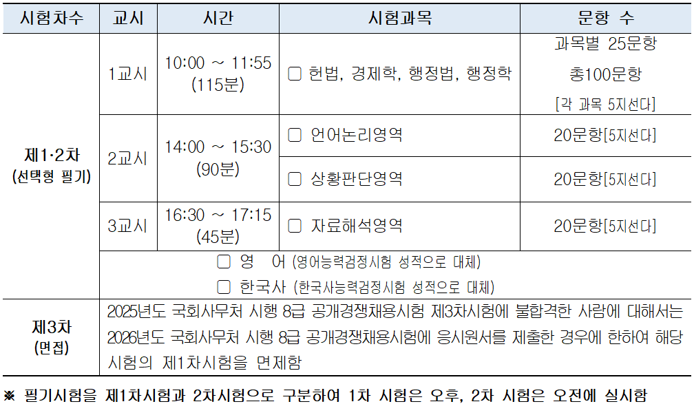 올해부터 국회사무처 8급 공채 필기시험은 PSAT(공직적격성평가) 중심으로 개편 되면서 제1차시험(언어논리영역·상황판단영역·자료해석영역)과 제2차시험(헌법·경제학·행정법·행정학)을 같은 날 시행 한다. 다만, 기존 시험 운영 방식과 달리 1차시험을 오후에, 2차시험을 오전에 실시하며, 1차시험에서 불합격할 경우 2차시험 성적은 무효 처리된다.