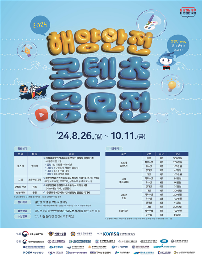 [피앤피뉴스=마성배 기자] 해양경찰청(청장 김종욱)과 해양수산부(장관 강도형)은 8월 26일부터 10월 11일까지 해양안전문화 확산을 위한 ‘2024 해양안전 콘텐츠 공모전’을 개최한다고 밝혔다.
