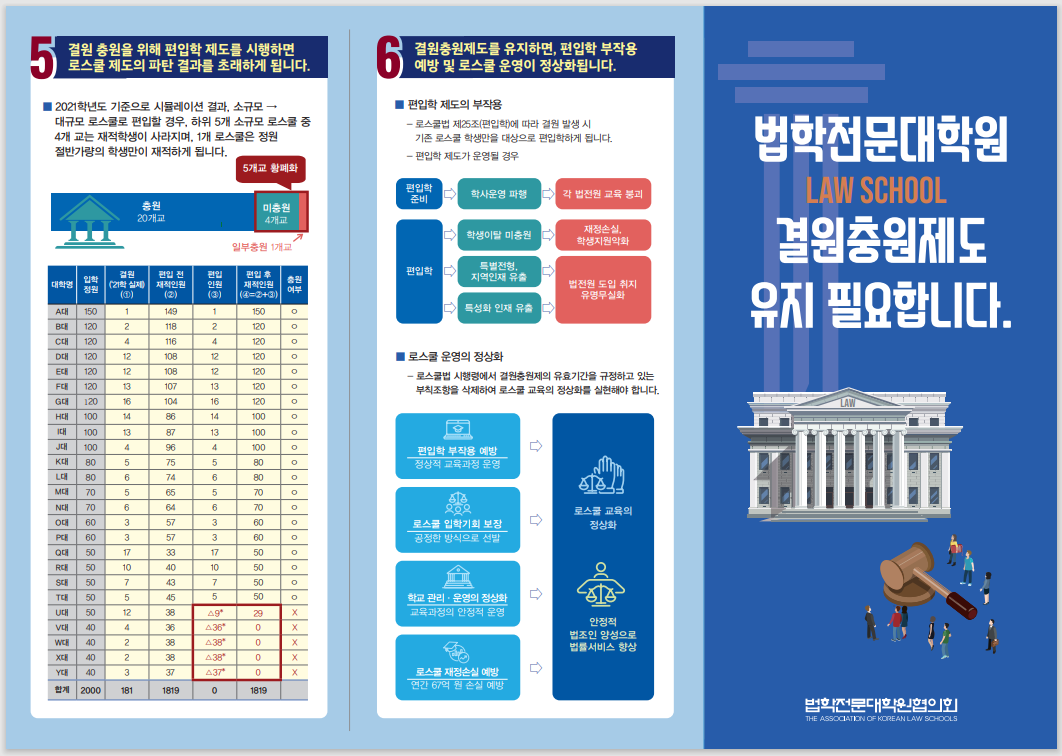 법무부가 로스쿨 학생들을 위해 장학금을 지급하거나, 로스쿨의 안정적 운영에 필요한 재정 지원을 하지 않으면서 결원충원제도를 반대하는 것은 무책임한 행태라고 비판하면서 결원충원제도의 중단은 특히 지방 로스쿨의 황폐화를 초래할 것이라며, 해당 지역 국회의원들에게 법률로 명시해 결원충원제도를 보장해줄 것을 요청했다.