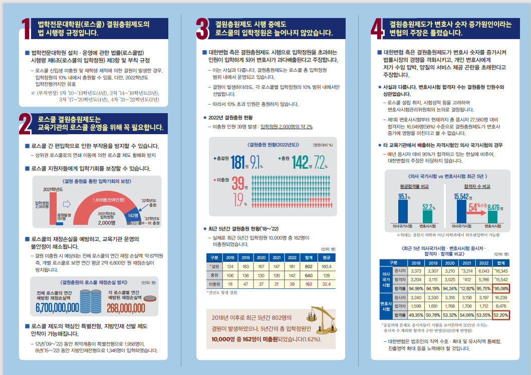 2023학년도 법학적성시험 응시자 3,032명을 대상으로 결원충원제도에 대한 설문조사 결과, 찬성이라고 답한 응시생이 2,785명(92%)이었다.