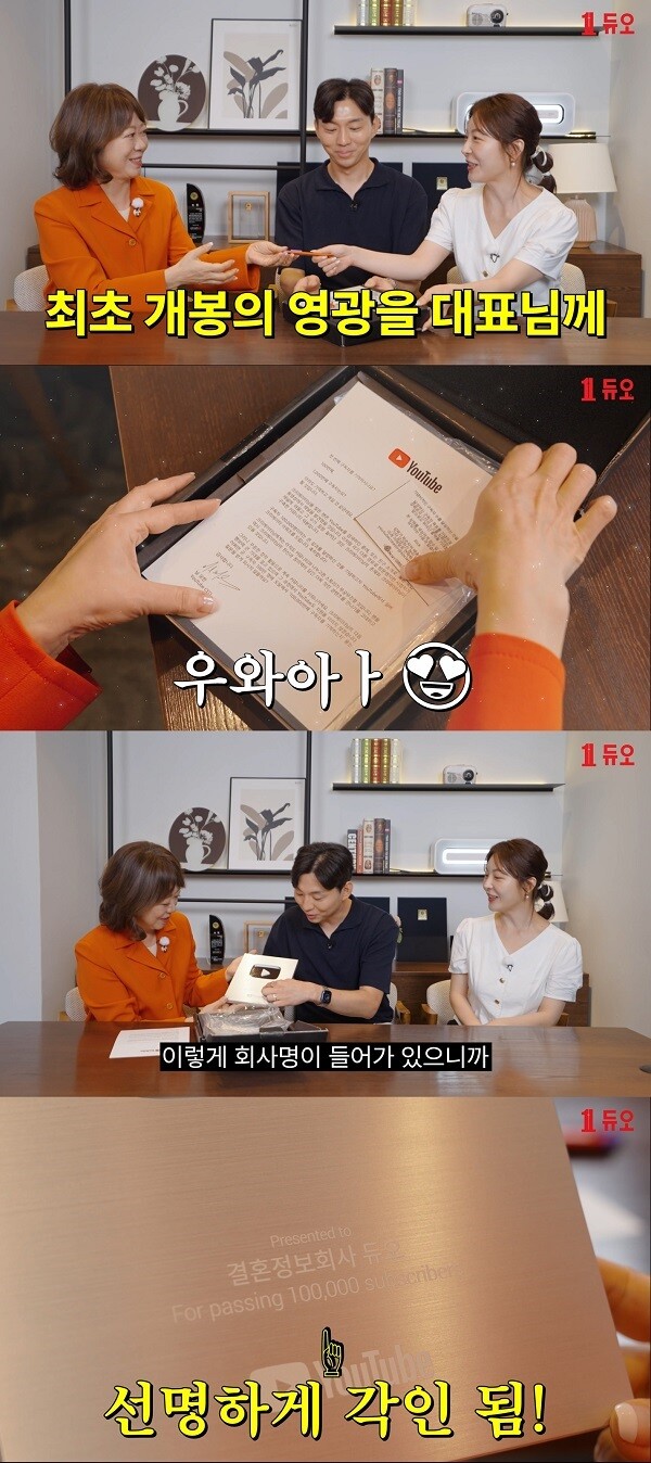 결혼정보회사 듀오(대표이사 박수경)의 공식 유튜브 채널이 구독자 수 10만 명을 돌파하며 ‘유튜브 실버 크리에이터 어워즈(실버버튼)’를 수상했다. 이를 기념해 박수경 대표가 언박싱 영상에 직접 깜짝 출연해 눈길을 끌었다.