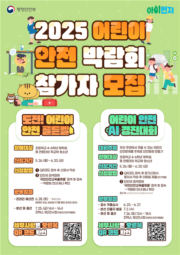 [피앤피뉴스=마성배 기자] 행정안전부가 오는 7월 24일부터 26일까지 경기도 고양시 킨텍스(KINTEX)에서 열리는 ‘2025 어린이 안전 박람회’ 참가 어린이를 5월 26일(월)부터 6월 20일(금)까지 모집한다.