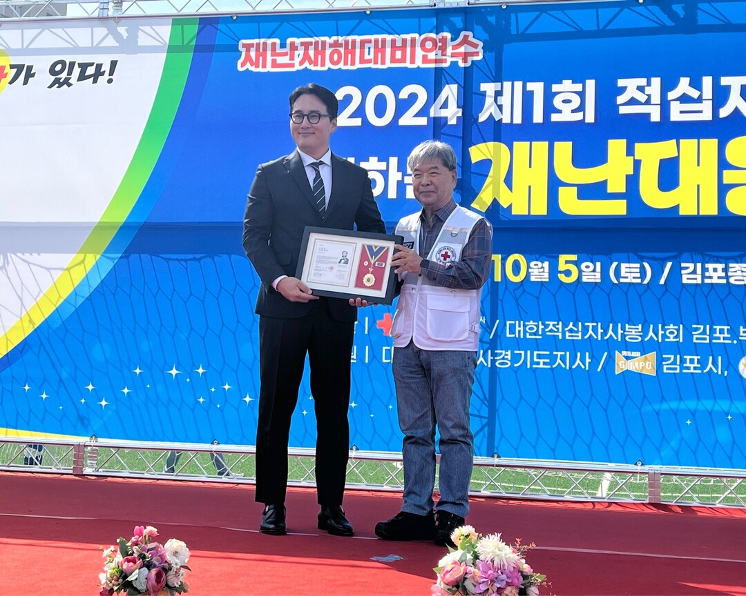 HR그룹(주) 신호룡 대표가 지난 5일 김포종합운동장에서 열린 '2024 제1회 적십자회원과 함께하는 재난대응훈련' 행사에서 대한적십자사 경기도지사 이재정 회장으로부터 적십자 회원유공장 명예장을 수상했다.