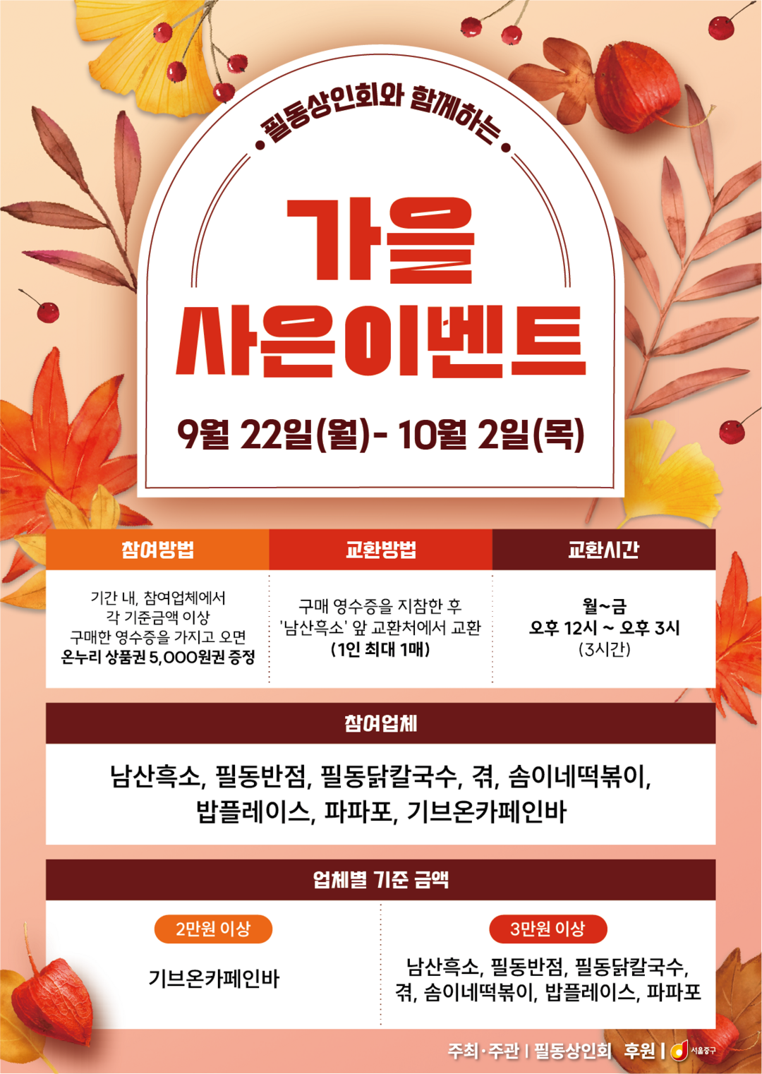 서울 중구 필동상인회는 9월 22일부터 10월 2일까지 ‘가을 필링 이벤트’를 진행한다.