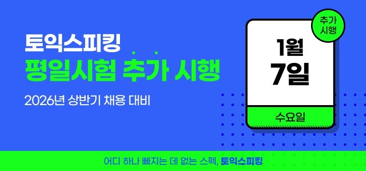 한국TOEIC위원회는 29일, 2026년 1월 7일 수요일 오후 6시 30분에 토익스피킹 평일 추가 시험을 시행한다고 밝혔다.