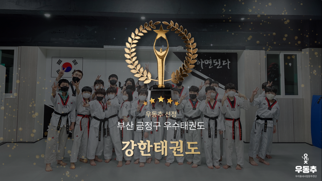 강한태권도는 우리동네사업장추천단(이하 우동추)이 선정한 '부산 금정구 남산동 대표 우수 태권도장'에 선정됐다고 밝혔다. 이는 부산 금정구 태권도장 중 우수한 교육기관임을 공식 인증받은 결과다.