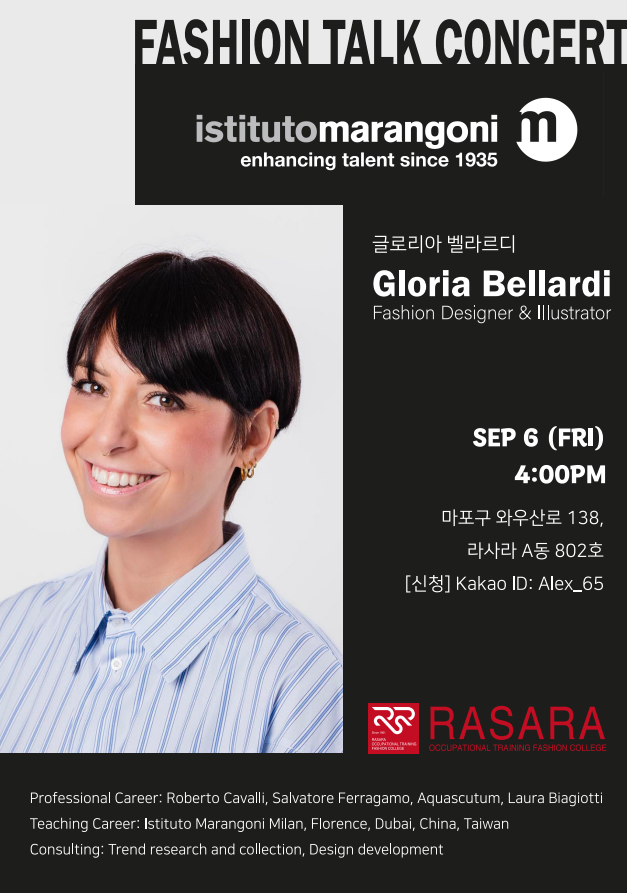서울 마포구에 위치한 라사라패션직업전문학교(이하 라사라)는 오는 9월 6일(금) 오후 4시 본교 A동 802호에서 이탈리아 밀라노에서 활동 중인 패션 디자이너 겸 일러스트레이터, 글로리아 벨라르디(Gloria Bellardi)를 초청해 패션 토크 콘서트를 개최한다고 밝혔다.
