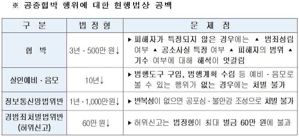 그러나 기존 법 체계에서는 협박죄를 적용하는 데 한계가 있었다. 협박의 피해자를 특정하기 어렵고, 협박 행위가 범죄로 성립하는 기준이 모호해 법적 판단이 엇갈리는 사례도 많았다. 이로 인해 일부 위협 행위는 실제 처벌로 이어지지 못하면서, 사회적 불안이 증폭됐다.