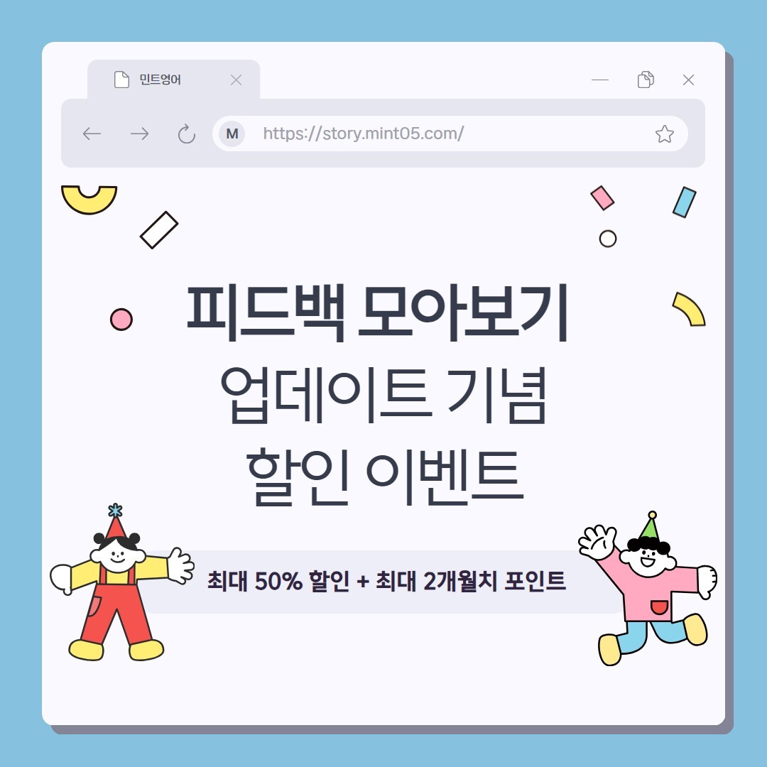 [피앤피뉴스=이수진 기자] 전화·화상영어 브랜드 민트영어가 피드백 모아보기 업데이트 기념 할인 이벤트를 이달 30일까지 진행한다. 이벤트 기간 중에 정규 수강권을 구매하면 최대 50% 할인 혜택 및 최대 2개월치 무료수업 포인트 적립을 제공한다고 밝혔다.