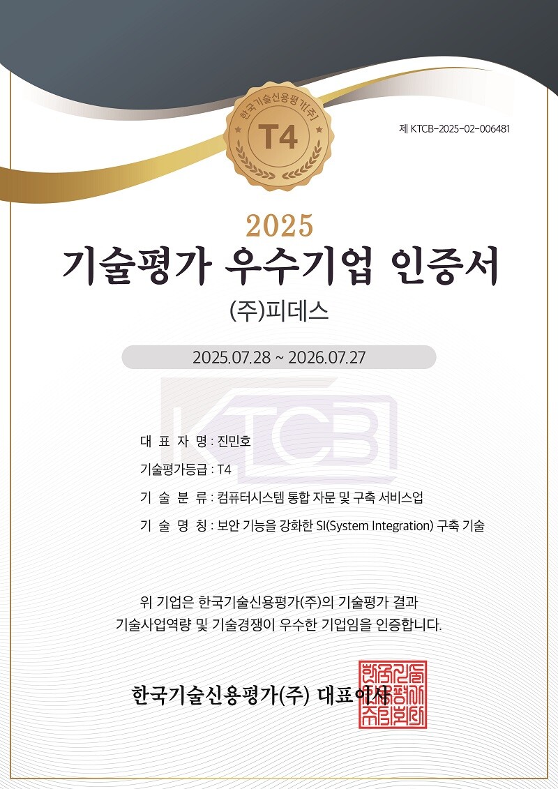 솔루션 개발 전문기업 ㈜피데스(대표 진민호)가 SCI평가정보의 기술평가(TCB, Technology Credit Bureau)에서 우수기술기업 인증 ‘T4’ 등급을 획득했다.