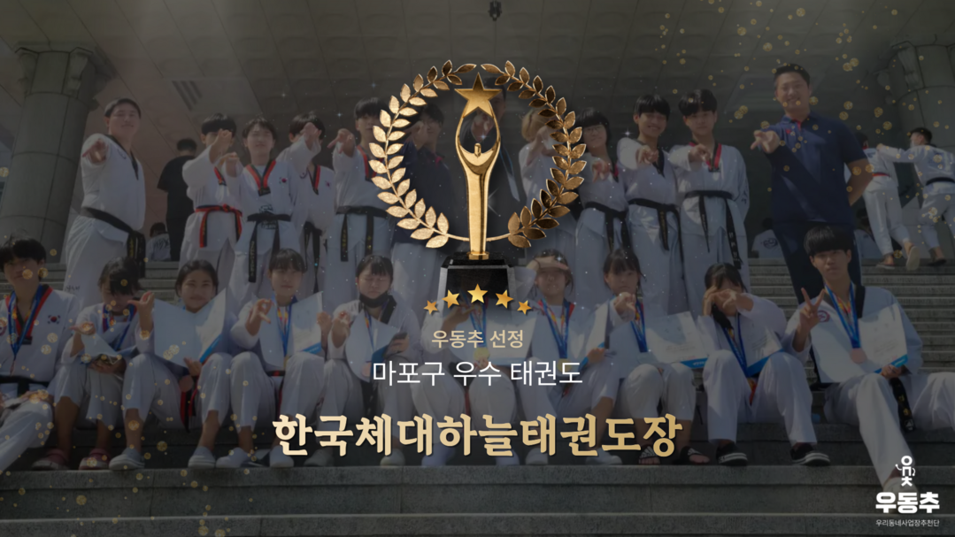 한국체대하늘태권도가 우리동네사업장추천단(이하 우동추)이 선정한 '마포구 상암동 대표 우수 태권도장'에 이름을 올렸다. 이는 마포구 태권도장 중 우수한 교육기관임을 공식 인증받은 것이다.