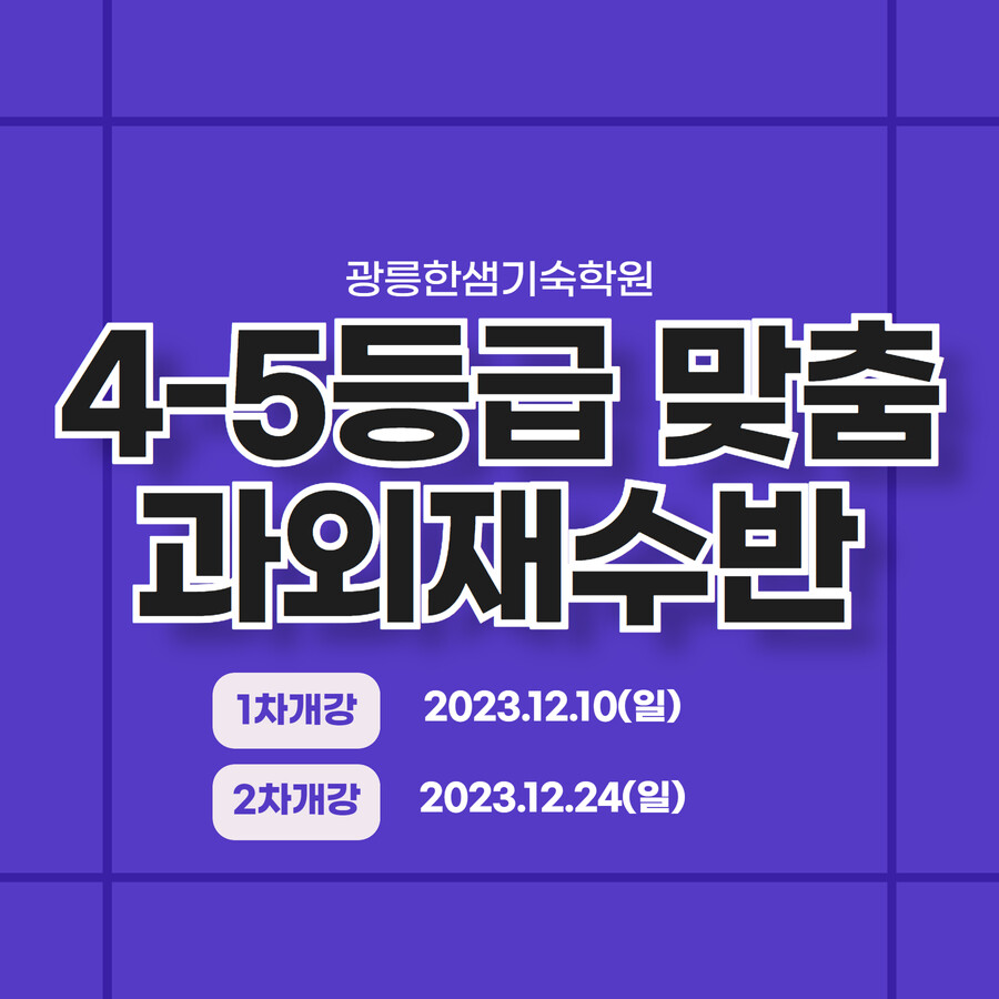 광릉한샘기숙학원 ‘1:6 그룹과외반’은 오는 2023년 12월 10일(일), 24일(일)에 각각 1차, 2차 개강한다. 자세한 사항은 홈페이지나 상담실로 문의할 수 있다.