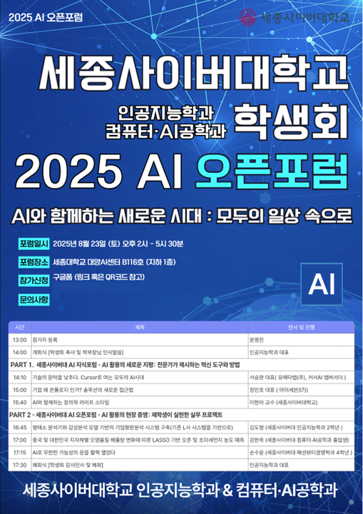 세종사이버대학교(총장 신구) 인공지능학과는 컴퓨터·AI공학과 학생회와 함께 지난 8월 23일(토) ‘세종사이버대학교 2025 AI오픈포럼’을 성황리에 개최했다고 밝혔다.