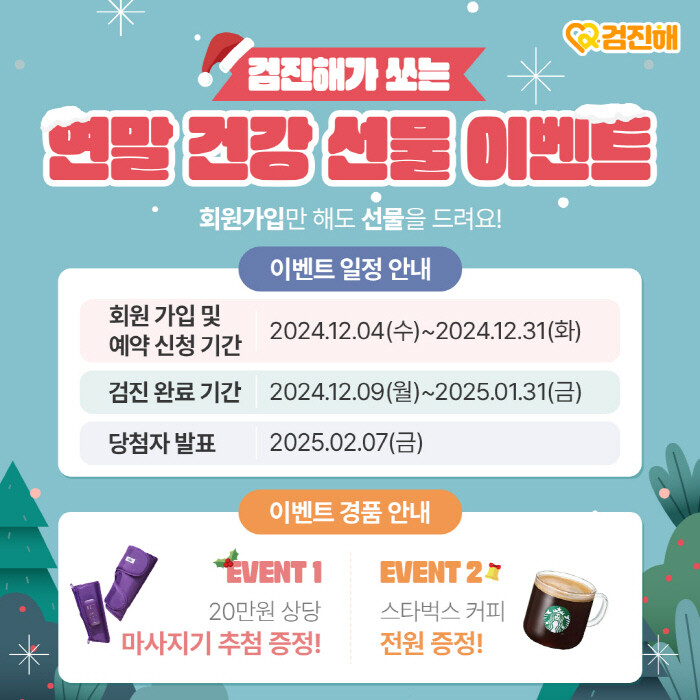 이번 ‘검진해가 쏘는 연말 건강 선물 이벤트’는 2024년 12월 4일부터 12월 31일까지 회원가입 및 종합건강검진을 예약한 사람들을 대상으로 진행된다. 이벤트 기간 내 회원가입을 하거나 종합검진을 예약하고 검진을 완료하면 자동으로 응모되며, 추첨을 통해 ▲락티브 데이랩 이뮨샷 플러스(2명), ▲쿠가횡성한우 1등급 갈비살 500g(2명), ▲풀리오 종아리 마사지기(1명) 등 푸짐한 경품을 받을 수 있다. 추가로 종합검진 예약자 전원에게는 스타벅스 아메리카노 기프티콘이 제공된다. 당첨자는 2025년 2월 7일 검진해 홈페이지에서 발표될 예정이다.
