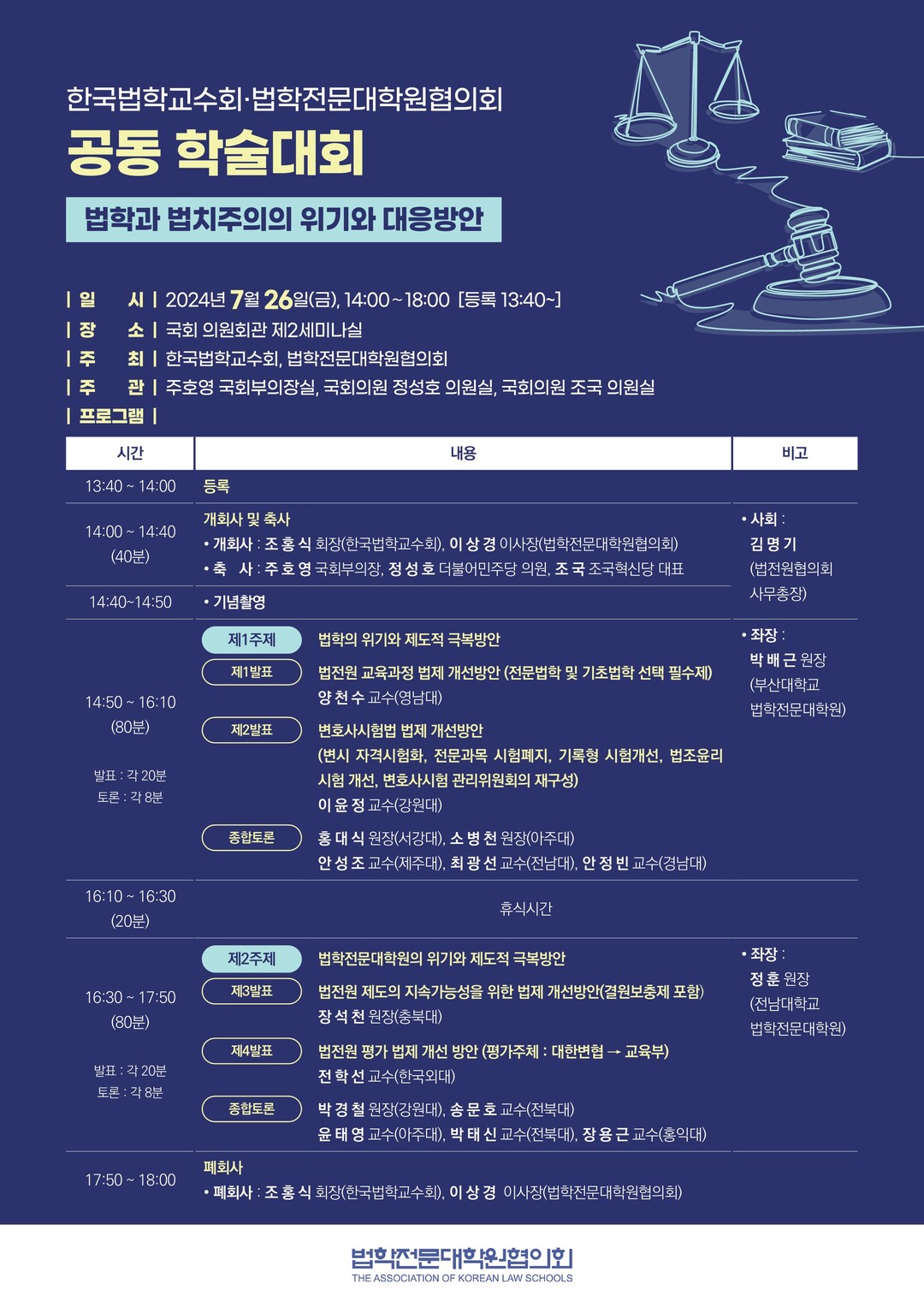 개회식 사회는 김명기 사무총장(법학전문대학원협의회)이 맡고, 조홍식 회장(한국법학교수회)과 이상경 이사장(법학전문대학원협의회)이 개회사를 진행할 예정이다. 축사는 주호영 국회부의장, 정성호 국회의원(더불어민주당), 조국 당 대표(조국혁신당)가 맡는다.