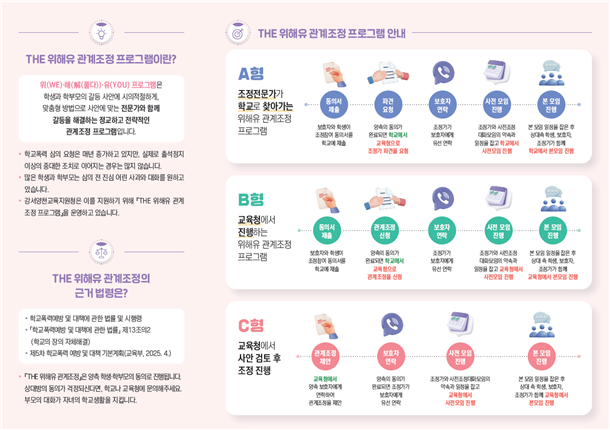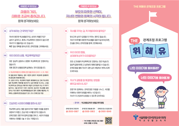 ‘THE 위해유’ 프로그램은 2024학년도부터 도입된 ‘WE.解.YOU’ 관계조정 시스템을 한층 고도화한 맞춤형 회복 프로그램이다. ‘Timing(적절한 시기)’, ‘Handling(유연한 방식)’, ‘Expert(전문 인력)’이라는 세 가지 핵심 전략을 바탕으로 학생·학부모·교사의 참여를 이끌어내며, 단순 갈등을 넘어 복합적 관계 회복까지 지원한다.