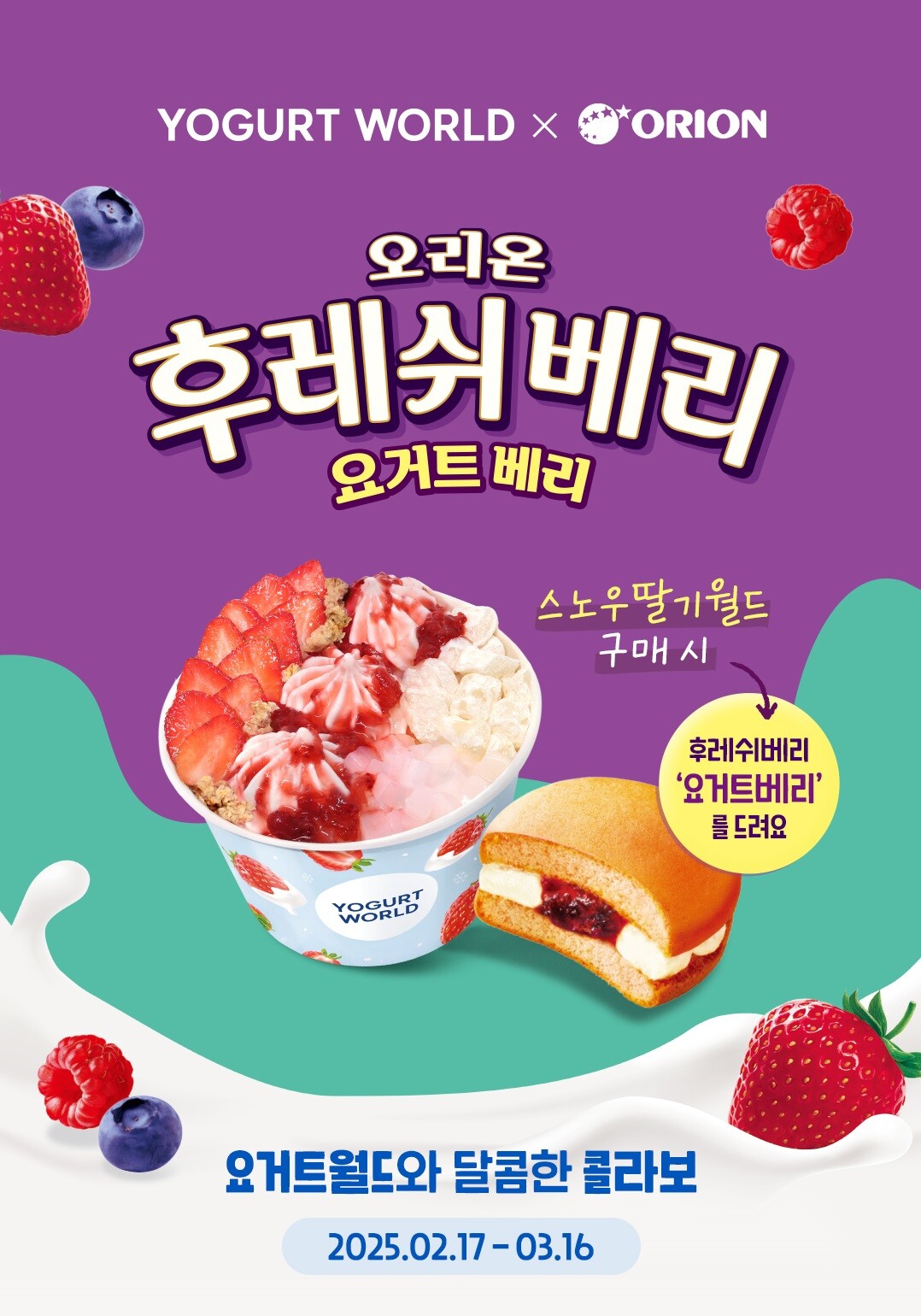 요거트월드의 인기 메뉴인 ‘스노우딸기월드’와 오리온의 ‘후레쉬베리 요거트베리’가 만나 다채로운 디저트 경험을 제공한다.