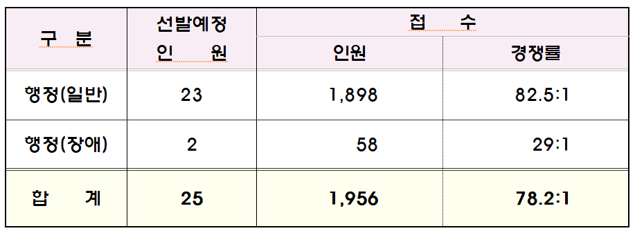 모집 분야별로는 23명을 선발하는 행정 일반분야에는 1,898명이 출원하여 82.5대 1을, 2명을 선발하는 장애인 분야는 58명이 지원하여 29대 1의 경쟁률을 보였다.