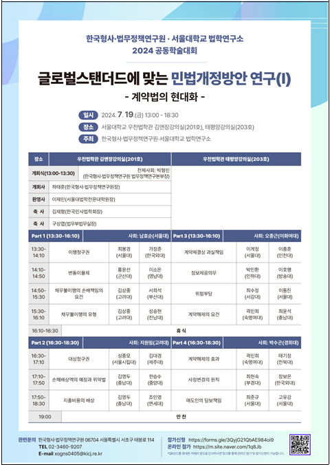 [피앤피뉴스=이수진 기자] 한국형사·법무정책연구원과 서울대학교 법학연구소는 오는 19일 ‘글로벌스탠더드에 맞는 민법개정방안 연구(I) - 계약법의 현대화’ 학술대회를 공동으로 개최한다고 17일 밝혔다.
