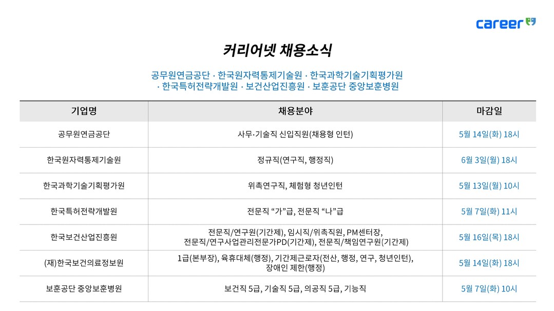 한국특허전략개발원, 한국보건산업진흥원, 한국보건의료정보원, 보훈공단 중앙보훈병원 등도 채용 발표