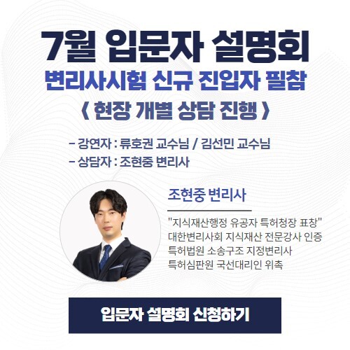 매월 첫째주 일요일 오후 6시부터 변리사 입문자설명회를 진행한다. 입문자설명회에서는 각 과목에 대한 시험전략을 설명하고 실시간 Q&A를 통해 입문자를의 궁금증을 해결한다.