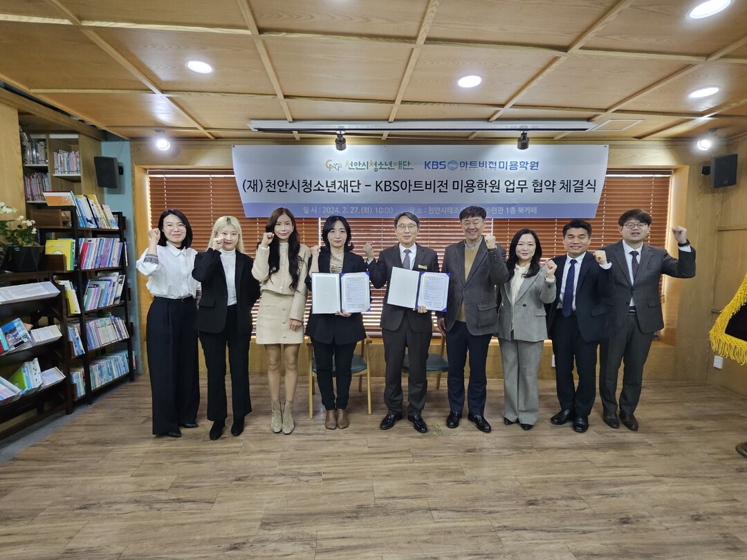 KBS아트비전미용학원천안점은 지역내 청소년들의 뷰티분야 진로활동 및 청소년들의 직업탐색 상호협력을 위해 (재)천안시청소년재단(대표이사 한상경)과 업무협약을 체결했다고 밝혔다. 이번협약은 태조산 청소년수련관에서 양측의 관련 담당자들이 참석한 가운데 진행되었다.