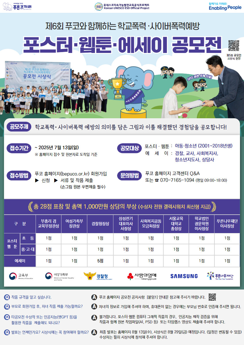 시상 규모도 역대급이다. 총 28점의 작품에 표창이 수여되며, 상훈은 부총리 겸 교육부장관상, 여성가족부장관상, 경찰청장상, 삼성전기 대표이사상 등 8개 기관이 참여한다. 이 외에도 사회복지공동모금회, 서울교육대학교, 광운학원, 푸른나무재단 등이 함께 시상에 나선다.
