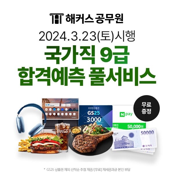 해커스공무원은 공무원 시험을 본 수험생들을 위한 다양한 이벤트도 제공하고 있다. 시험 당일 ‘합격예측 풀서비스’에서 오늘 오후 3시까지 채점한 전원에게는 GS25 2천 원권을 증정하며, 당일 선착순 채점자 50명 전원에게 버거킹 와퍼 세트를 제공한다.