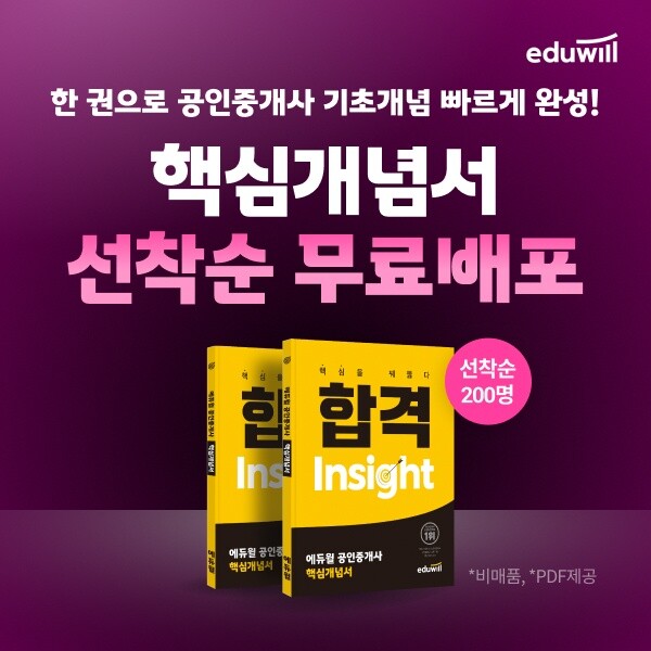 공인중개사 기초 개념을 빠르게 정리할 수 있는 ‘핵심개념서’는 에듀윌 회원이라면 누구나 신청할 수 있고, 매일 선착순 200명에게 무료로 제공된다.