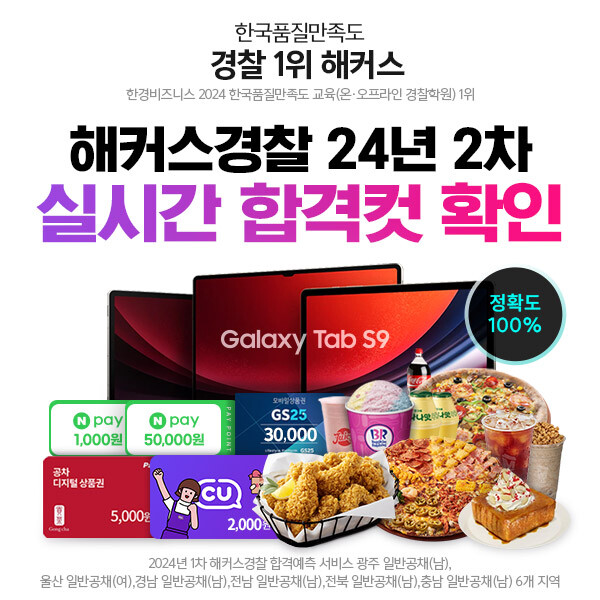 추가로 해커스경찰은 ‘합격예측 풀서비스’에서 채점만 해도 다양한 혜택을 제공한다고 밝혔다. 먼저, 오늘 15시 이전까지 채점한 전원에게는 네이버페이 1천 원을 제공하며, 사전예약을 진행한 사람 중 추첨을 통해 갤럭시탭 S9 FE 플러스(*1명, 제세공과금 본인 부담)도 무료로 제공한다.