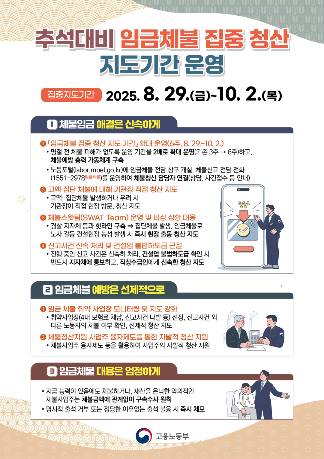 [피앤피뉴스=마성배 기자] 고용노동부(장관 김영훈)가 추석 명절을 앞두고 8월 29일부터 10월 2일까지 6주간 ‘임금체불 집중 청산 지도기간’을 운영한다.