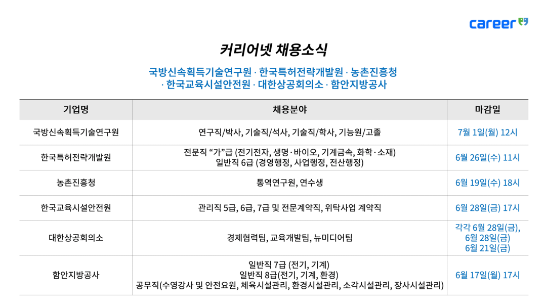 [피앤피뉴스=마성배 기자] 커리어넷이 17일 농촌진흥청, 한국교육시설안전원, 대한상공회의소, 함안지방공사, 국방신속획득기술연구원, 한국특허전략개발원 채용 소식을 알렸다.