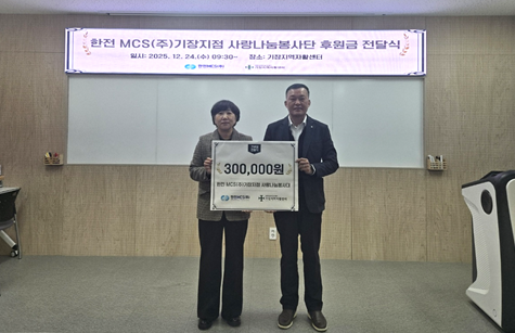 한전MCS(주)기장지점 사랑나눔봉사단은 2025년 12월 24일 오전 9시 30분 기장지역자활센터에서 후원금 전달식을 진행했다. 이날 전달식에는 한전MCS(주)기장지점 관계자와 기장지역자활센터 관계자들이 참석해 나눔의 의미를 공유했다.
