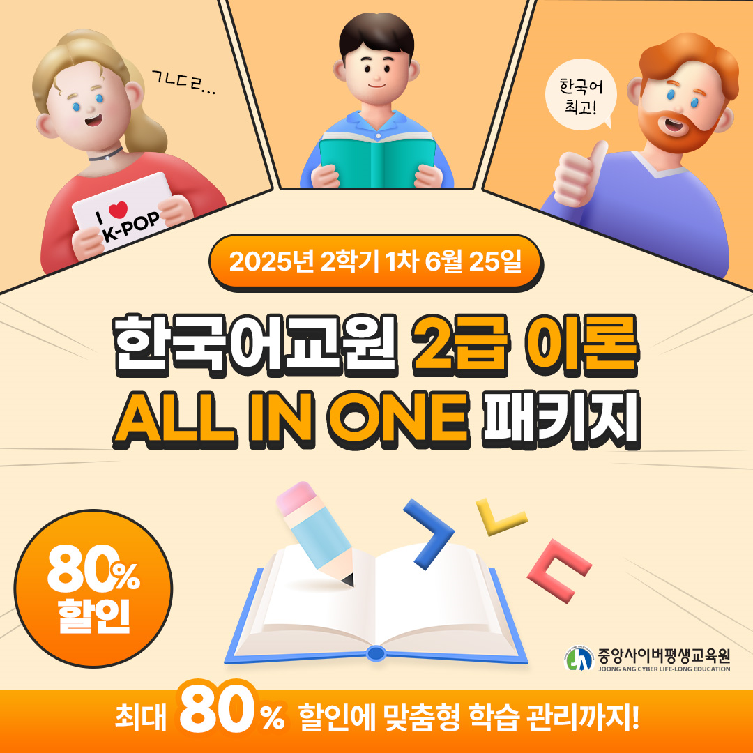 학점은행제 원격교육기관인 중앙사이버평생교육원에서 2025년 2학기 1차 과정으로 한국어교원 2급 이론 올인원 패키지 할인 이벤트를 진행한다고 밝혔다.