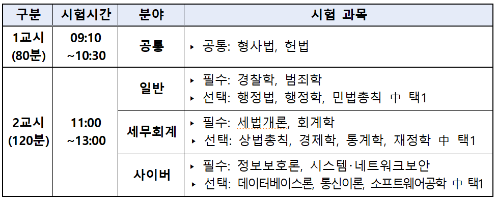 일반 시험은 필수과목으로 형사법·헌법·경찰학·범죄학을, 선택과목으로 행정법·행정학·민법총칙 중 택 1을 시험 보게 된다.