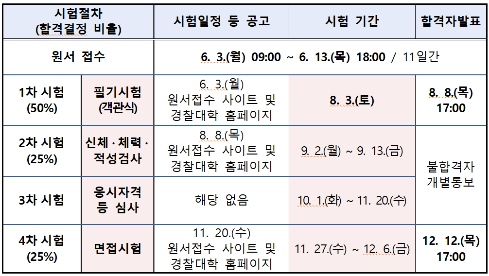 1차 필기시험을 8월 3일(토) 시행 후 합격자를 8월 8일(목) 발표한다. 이어 2차 신체·체력·적성검사를 9월 2일~13일까지 실시하고, 3차 응시자격 등 심사를 10월 1일부터 11월 20일까지 진행한다.