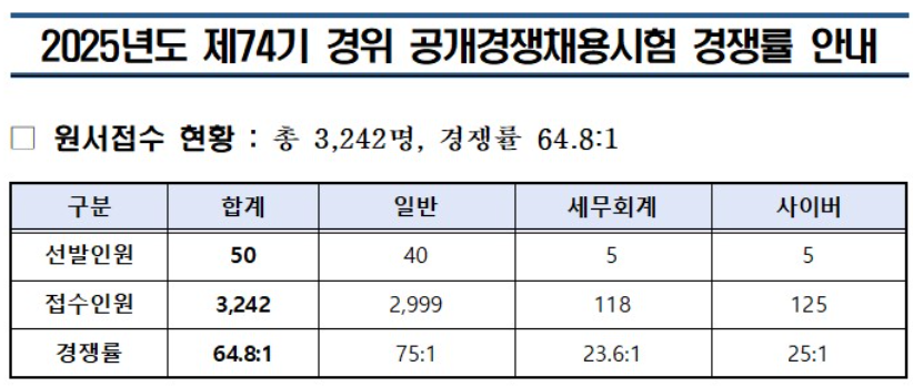 [피앤피뉴스=마성배 기자] 오는 8월 3일 시행되는 2025년도 제74기 경위 공개경쟁채용시험 경쟁률이 공개됐다.