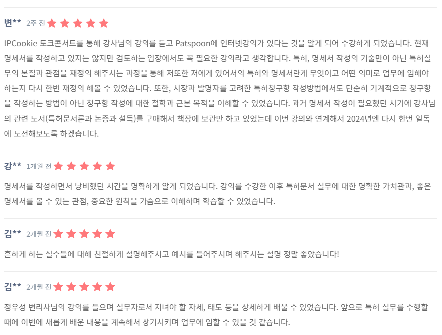 팻스푼은 다양한 강의와 웨비나를 개최하며 IP 실무자들을 위한 컨텐츠들을 제공하고 있다. 강의료 100% 이벤트와 강의 신청은 patspoon 공식 홈페이지에서 확인이 가능하다.